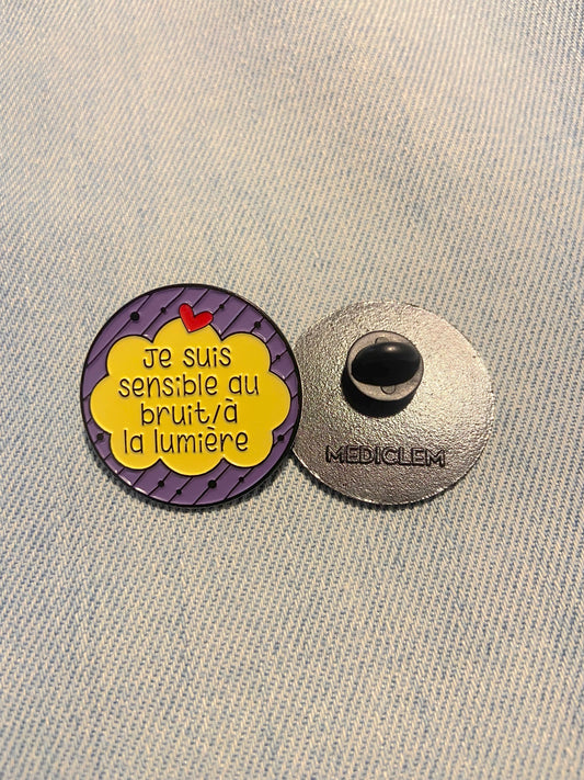 Pin's JE SUIS SENSIBLE AU BRUIT/A LA LUMIERE